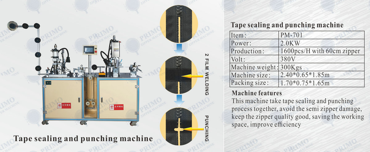 This machine take tape sealing and punching process together, avoid the semi zipper damage, keep the zipper quality good, saving the working space, improve efficiency