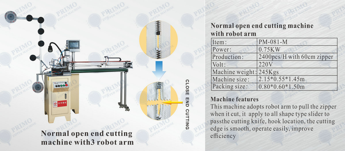 Normal close end cutting machine with robot arm It is suitable for bag, luggage and bedding zippers. Product Name: Normal close end cutting machine with robot arm Model Number: PRIMO PM-082-M