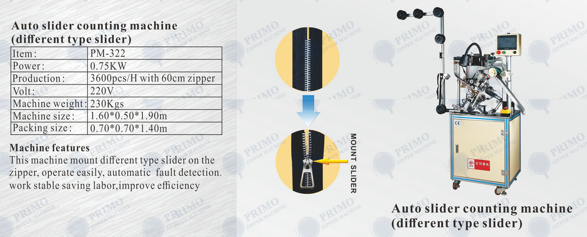 "Auto slider counting machine (normal type slider) ltem:PM-321 Power:0.75KW Production:3600pcs/ H with 20cm zipper Volt:220V Machine weight:245Kgs Machine size:1.30*0.55*1.75m Packing size:0.75*0.60*1.60m" This machine mount normal type slider on thezipper, operate easily, automatic fault detection,work stable saving labor, improve efficiency